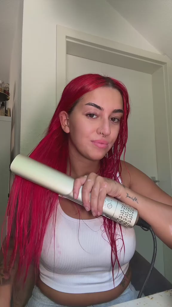 Das ist einer der größten Vorteile: Es gibt keine extrem heißen Metallplatten, die Wasser aus dem Haar ziehen oder Fasern beschädigen. Da das Gerät ausschließlich mit Luft arbeitet, bleibt die natürliche Feuchtigkeit besser erhalten. Das Haar fühlt sich nach dem Styling nicht trocken oder spröde an. Für viele, die regelmäßig glätten, ist das deutlich schonender – besonders bei colorierten, blonden oder brüchigen Haaren.